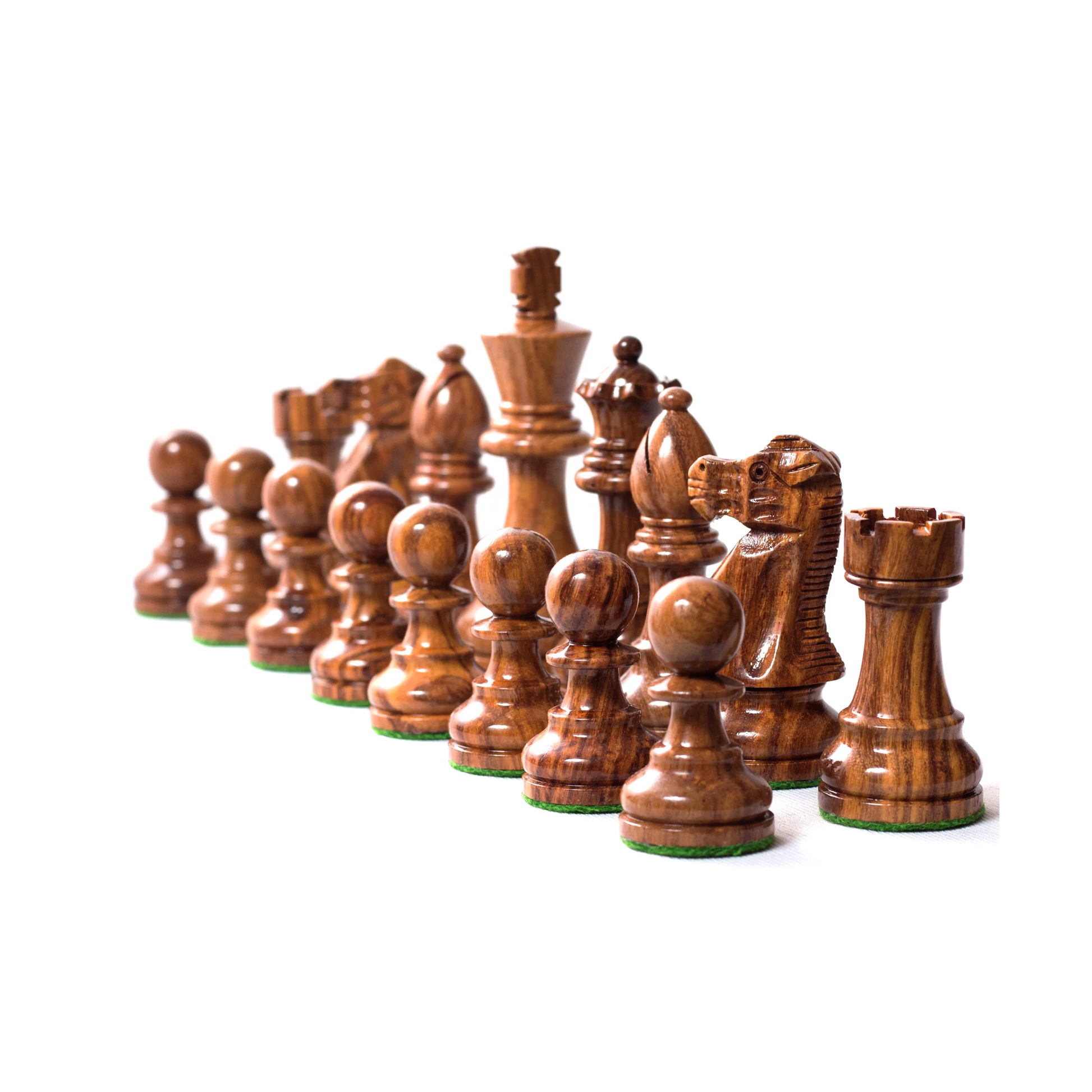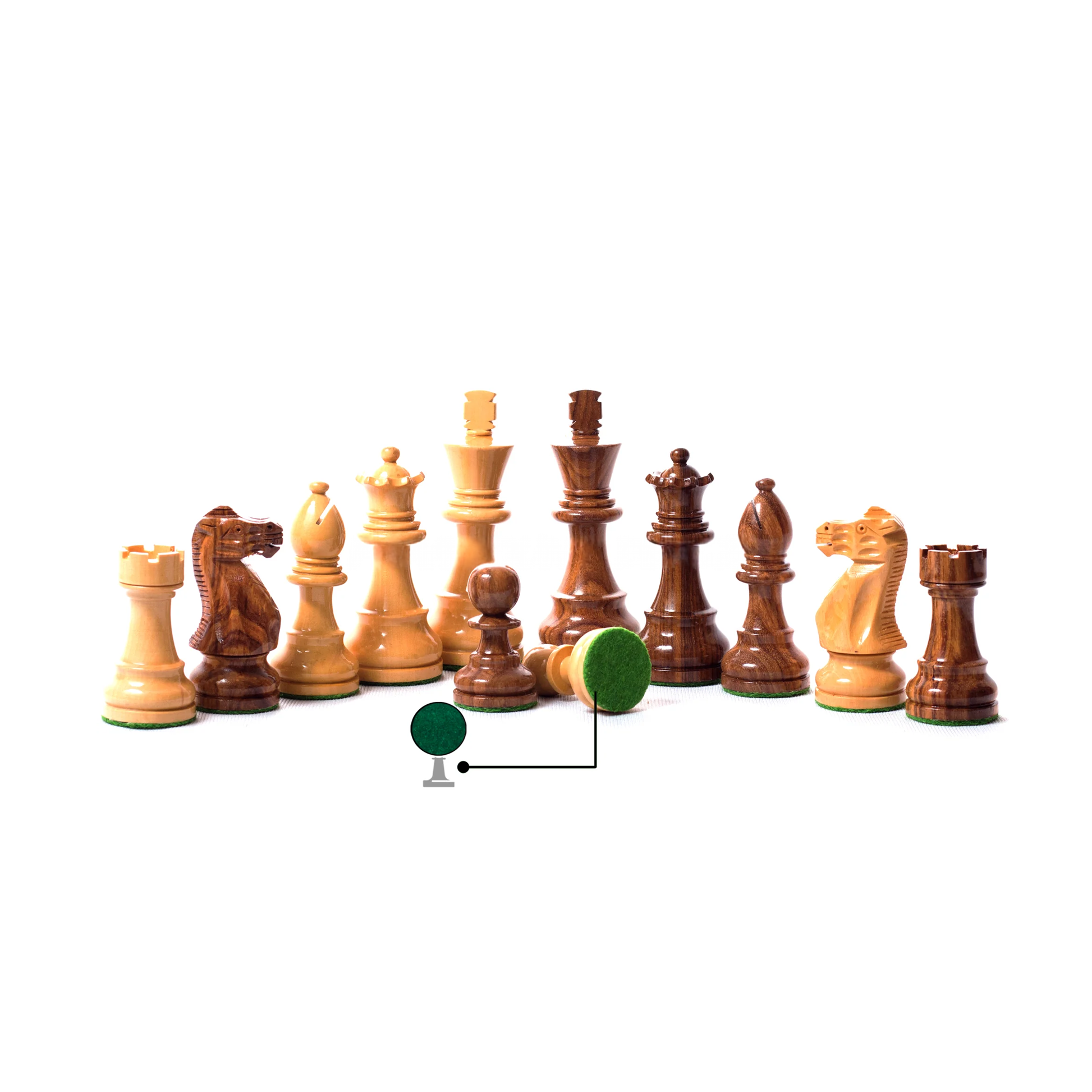 Design & Build Quality : All of the chess pieces bases have hand-selected thick green felt that feels luxurious & also provides for better stability. The thick green felt precisely envelops the base of each chessmen. The thick green felt also helps to protect the finish & surface of the chess board from scratches, which is why we crafted it as passionately as we did. Chess pieces are beautifully crafted in Indian Rosewood & natural boxwood.