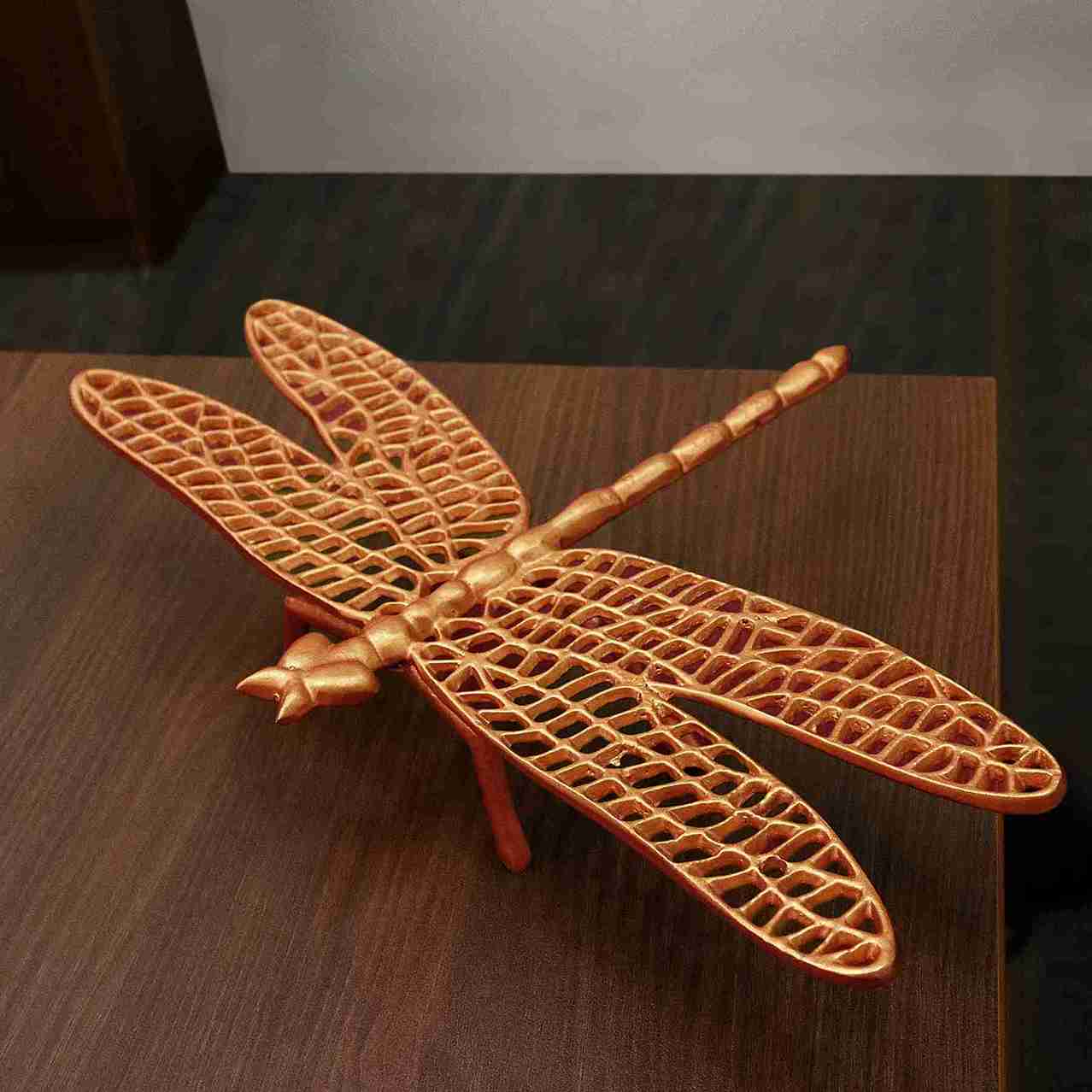 A captivating metal dragonfly table decor, adorned with intricate wings, boasting a radiant bronze gold finish. Its graceful form lends an air of elegance to any space, evoking a sense of whimsy and sophistication.