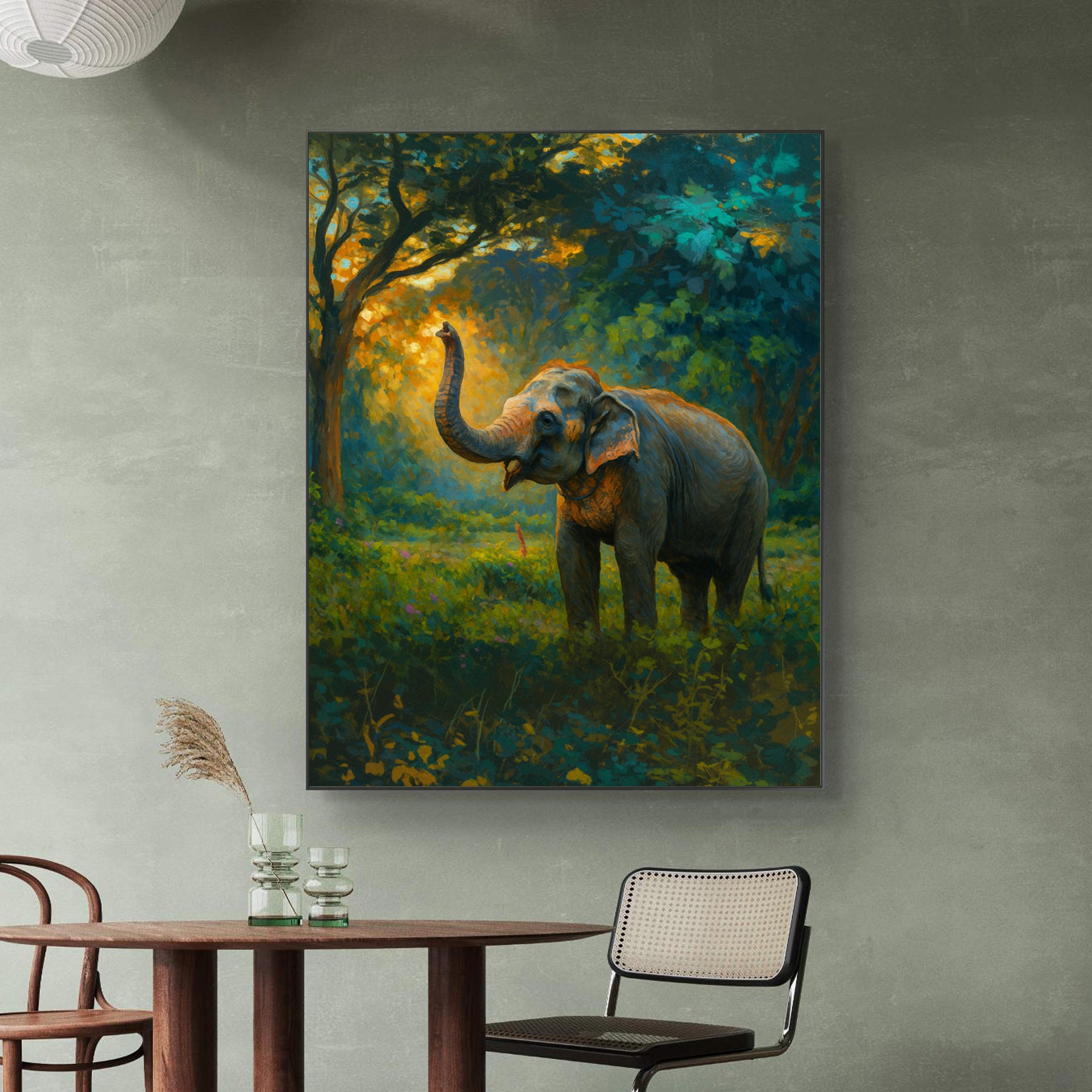 This elephant art frame radiates prosperity, symbolizing strength, wisdom, and abundance. The majestic elephant, painted with vibrant colors, embodies resilience and good fortune. Surrounded by nature’s harmony, it reflects balance and growth. Perfect for home or office, the artwork invites wealth, positivity, and serenity, making it a timeless emblem of prosperity.