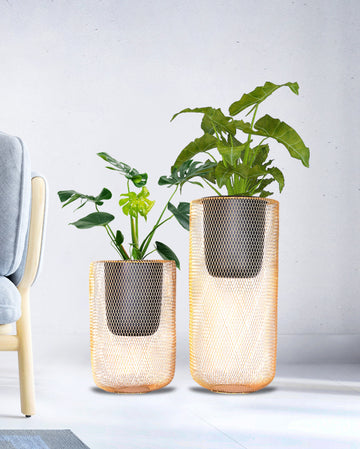 Matt black metal planter with golden mesh cover With the stunning combination of matt black and golden mesh, this floor planter combo adds dimension to your interior, be it home or your office. Packed with perfection, this planter comes is the best decor for your interior