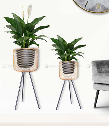 Matt black metal planter with golden mesh cover.With the stunning combination of matt black and golden mesh, this floor planter combo adds dimension to your interior, be it home or your office. Packed with perfection, this planter comes with detachable legs that can be fitted with ease at the time on unpacking. By all, the best de?cor for your interior.