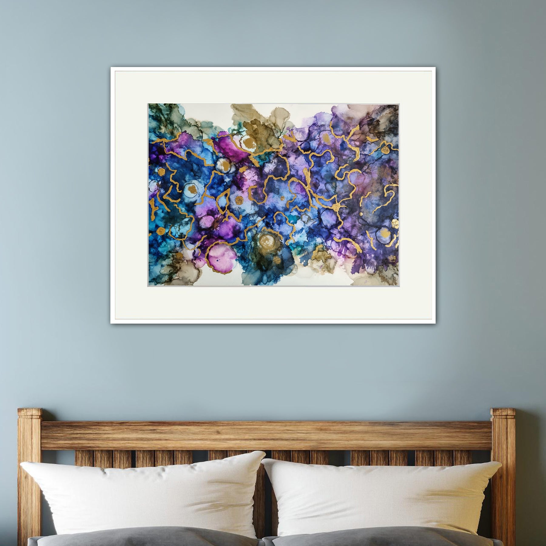 The Mystic Nebula Artframe captures the essence of cosmic beauty with its swirling hues of deep blues, purples, and radiant gold highlights. Resembling galaxies and starlit skies, this abstract masterpiece adds mystery and elegance to interiors. Perfect for modern spaces, it evokes wonder, depth, and timeless sophistication in home décor.