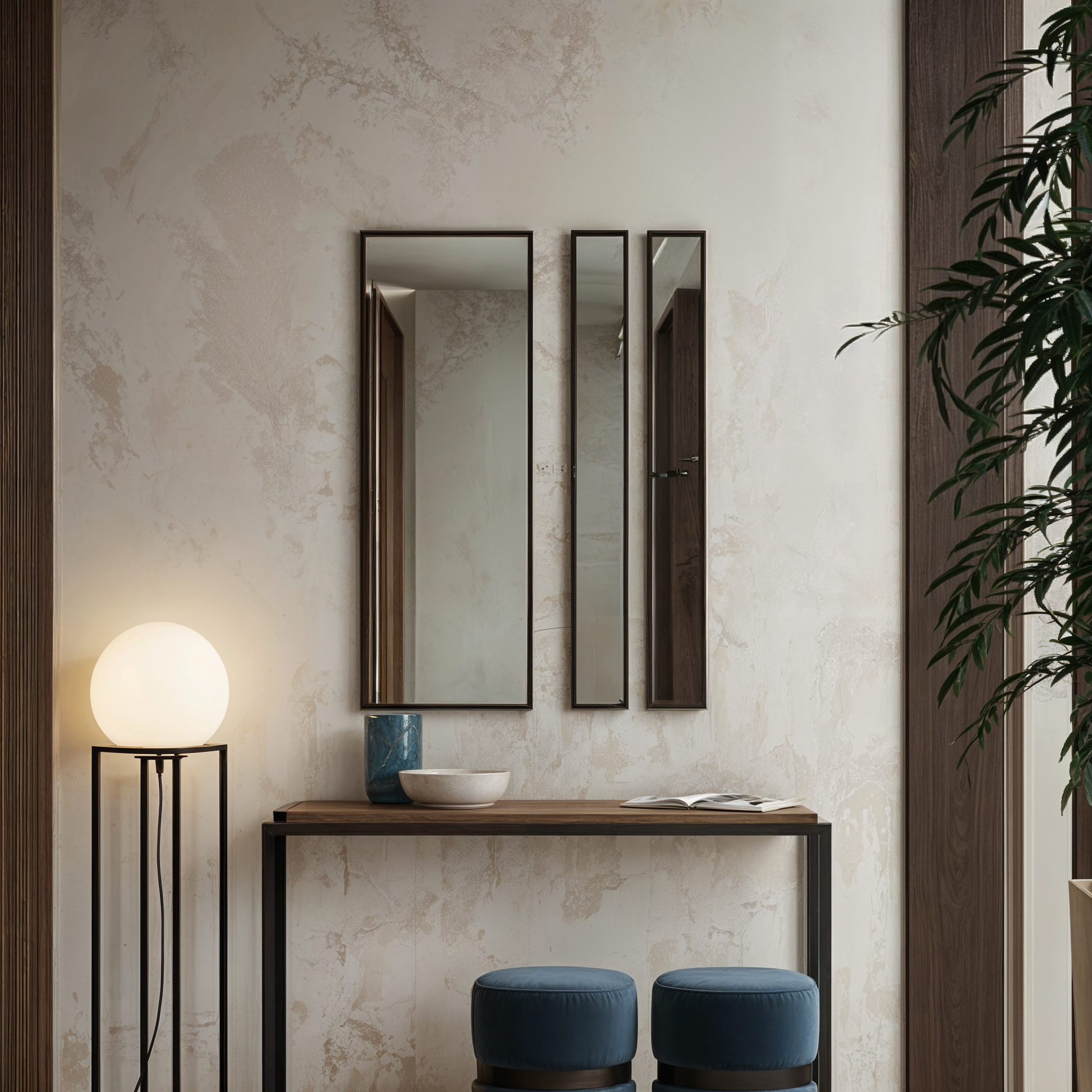 Triple Rectangle Wall Mirror features a striking trio of aligned rectangular mirrors, creating a bold geometric statement. Its clean lines and symmetrical design enhance depth and light, making it perfect for modern and contemporary interiors. This mirror adds both visual interest and functional elegance to hallways, living rooms, or bedrooms.